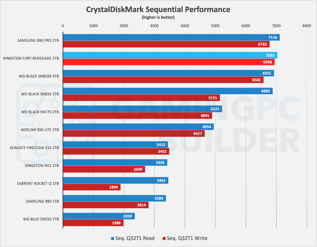 CrystalDiskMark is a bit more forgiving than AS SSD in terms of peak transfer rates and also allows the 2TB Kingston Fury Renegade to surpass the WD_Black SN850X by a small margin.